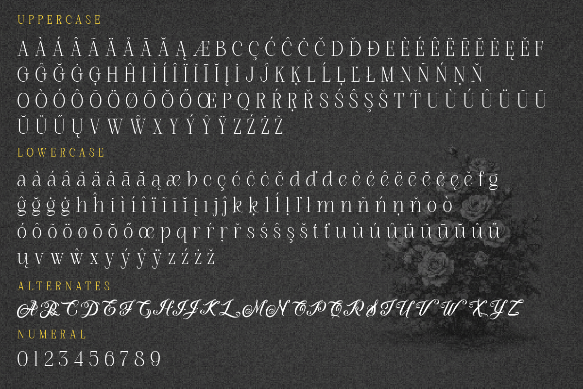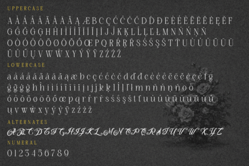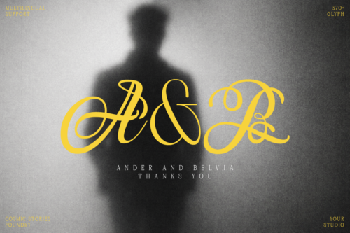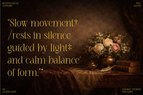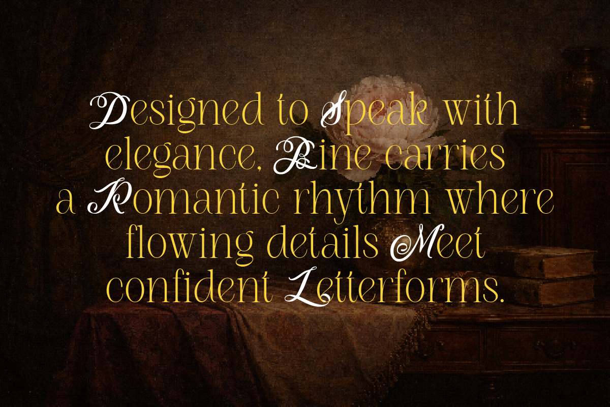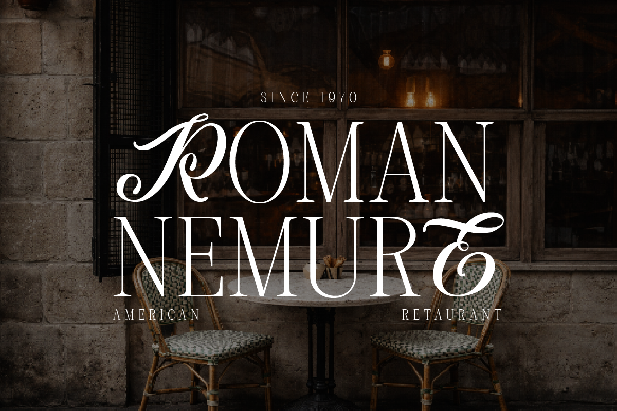Roman Nemure is an elegant serif font that blends classic elegance with a touch of 80s romance. Its characters are bold yet graceful, with gently flowing swashes and ligature details—creating a luxurious, artistic, and timeless look all in one.